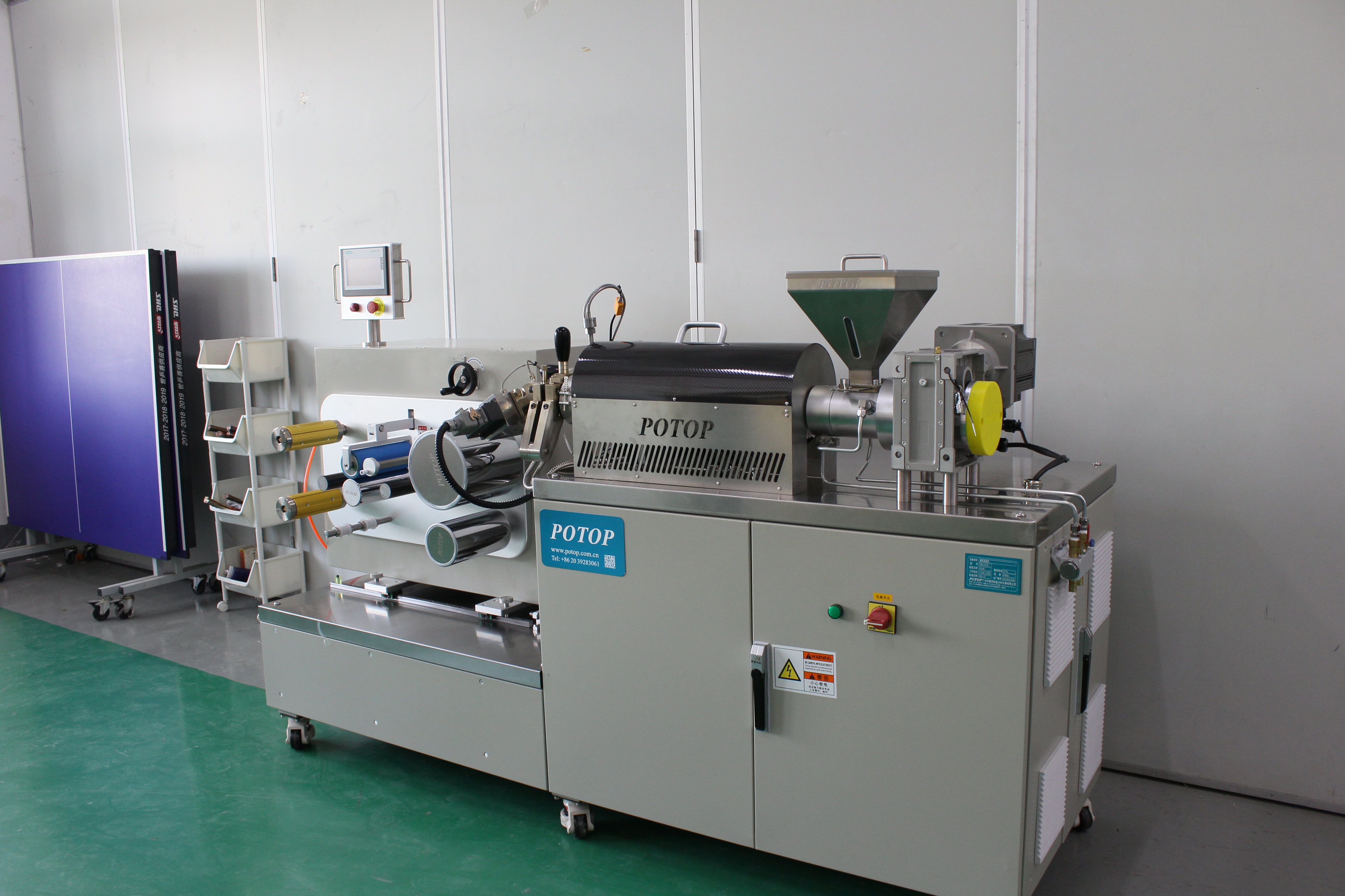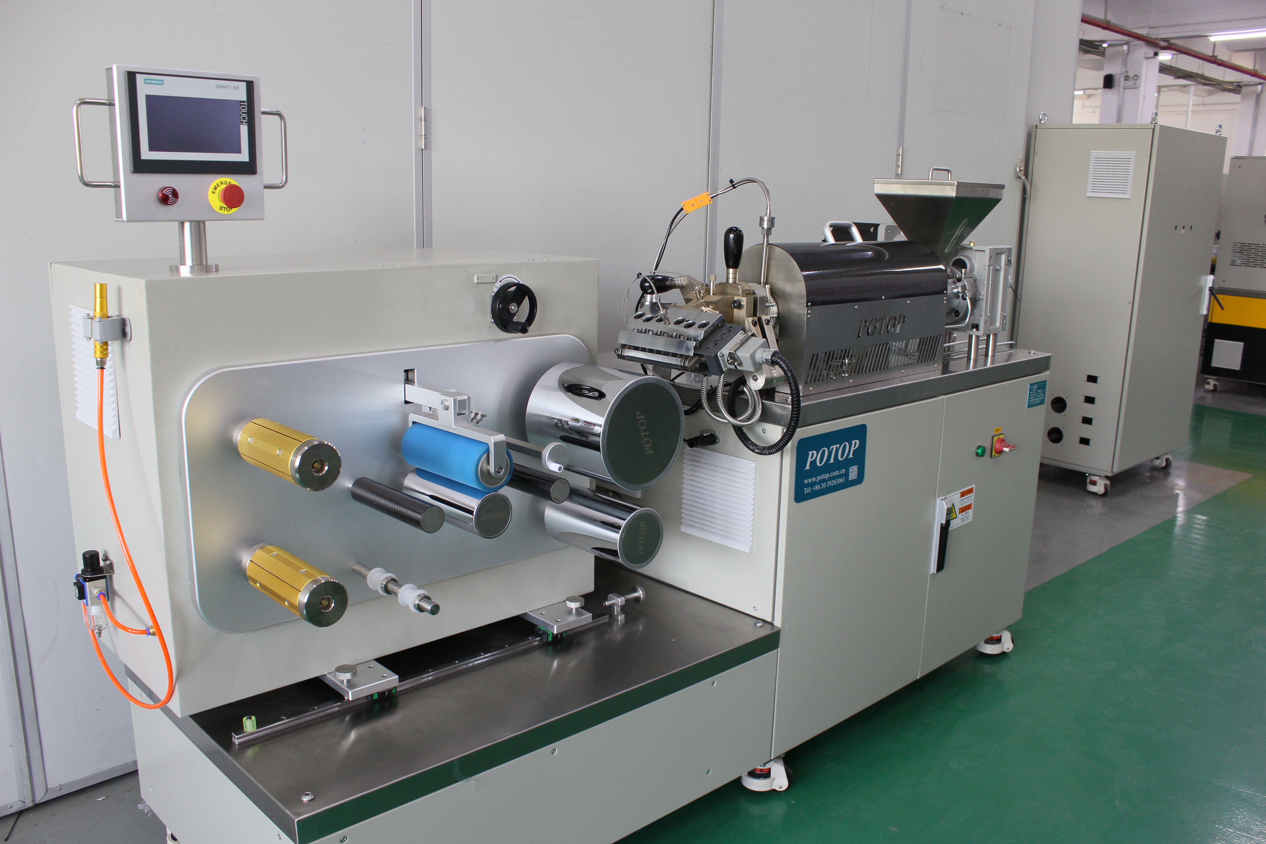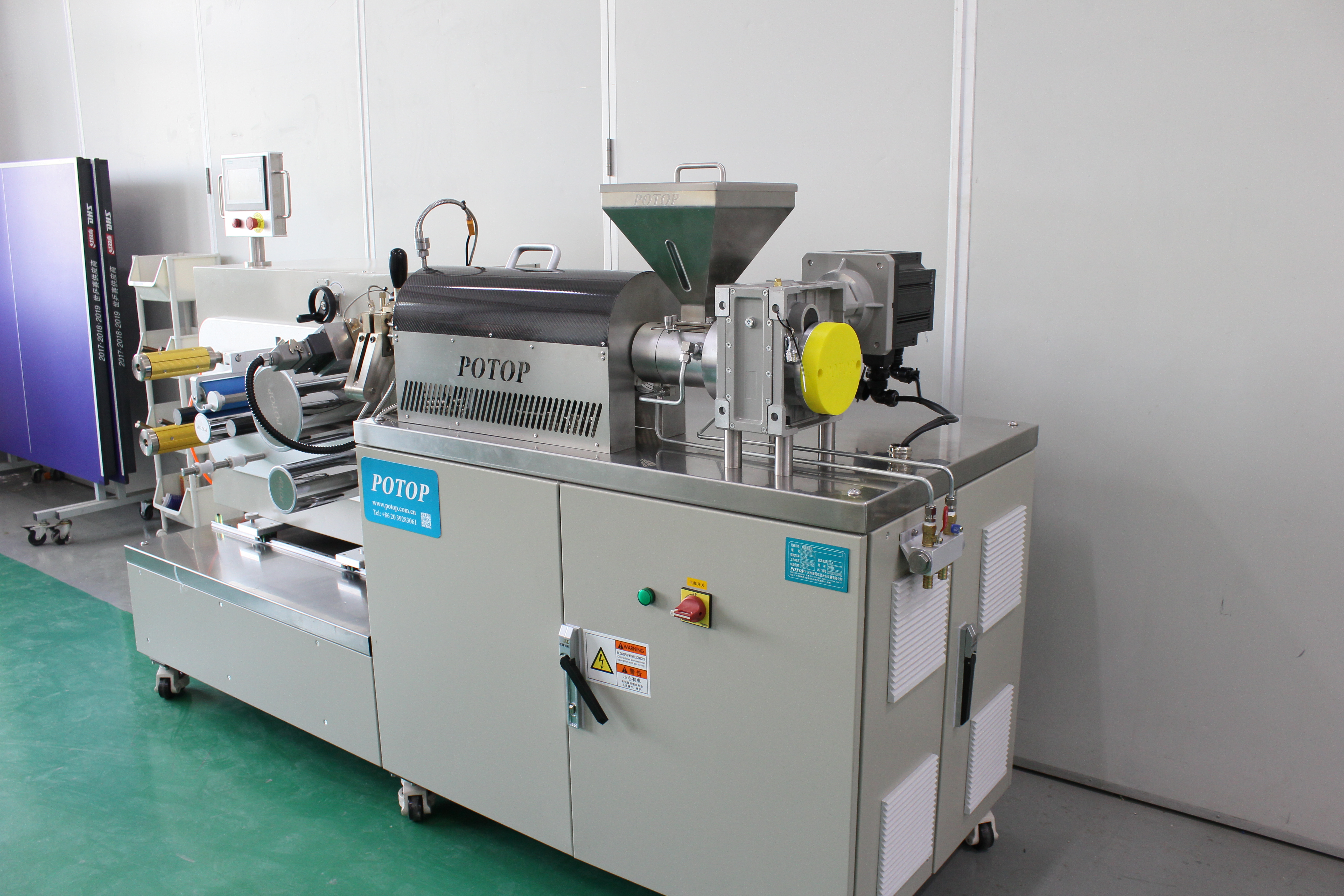 广州普同研发的桌面小型精密挤出流延机,最大的优点是可在接近于实际加工的条件下进行测试。在测试过程中的熔体温度、熔体压力、螺杆转速、电机转矩等参数将会以数值和曲线等多种形式实时显示(可高配电脑数据采集系统),以供用户进行数据分析与优化。