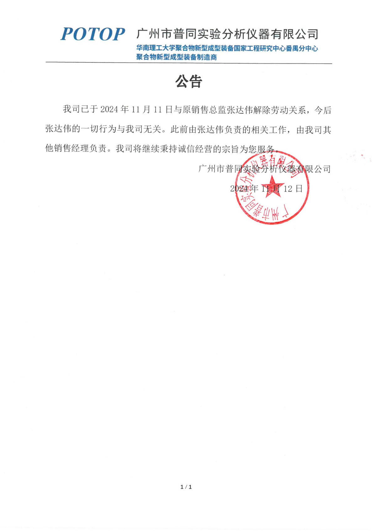我司已于2024年11月11日与原销售总监张达伟解除劳动关系,今后张达伟的一切行为与我司无关。此前由张达伟负责的相关工作,由我司其他销售经理负责。我司将继续秉持诚信经营的宗旨为您服务。