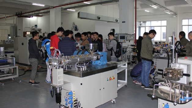 2015.12广东轻工职业技术学院塑机141和塑机142班共84名学生与2015年12月15日,在何亮、谭寿再、陈金伟和庄文柳等老师的带领下来我公司进行参观实习,期间,我司工程师详细讲解了我司设备机械原理及功能,也解决了学生们提出的问题,积极配合其教学资料库课程素材收集工作!